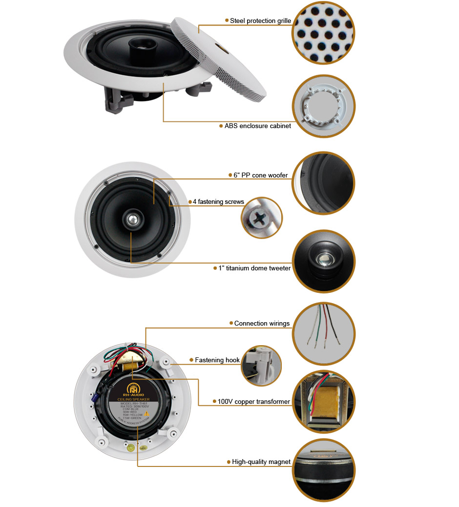 The RH-AUDIO RH-TH61 employs ABS enclosure and metal protection grille, 6”PP cone woofer and 1”dome tweeter mounted in coaxial way,provides premium performance in background,voice announcement and alarm broadcast system.